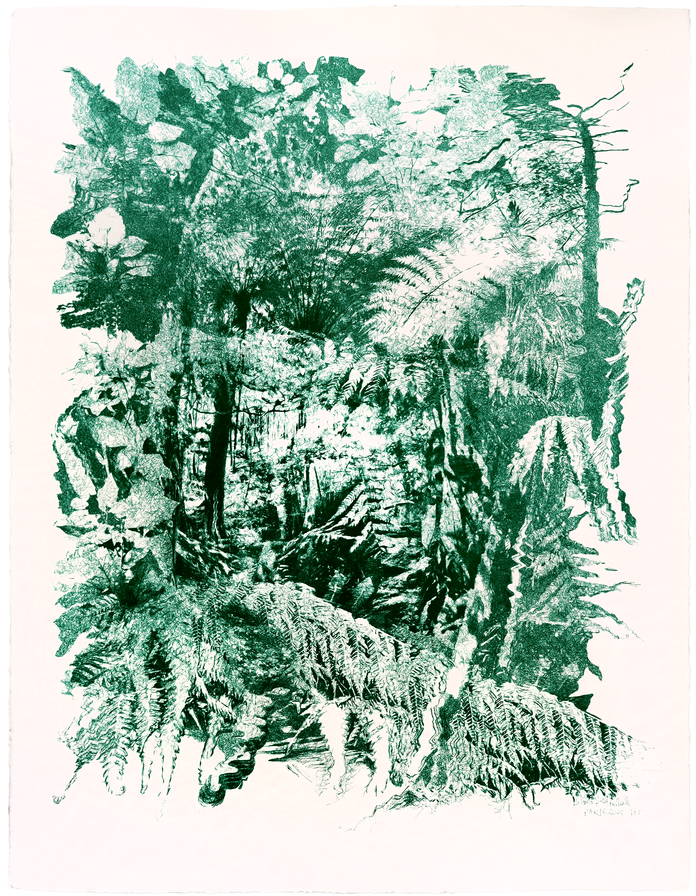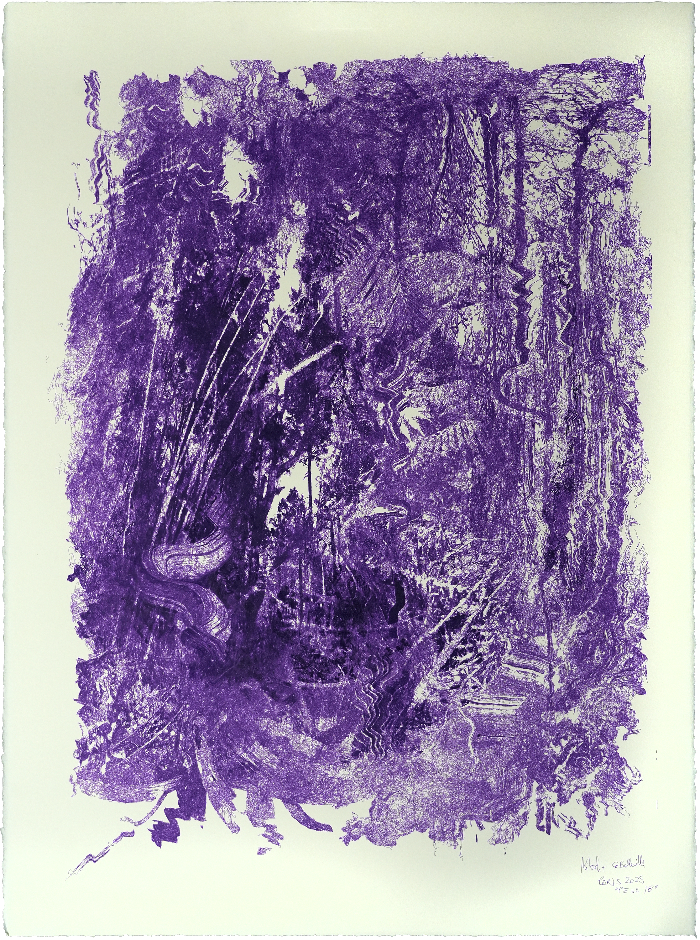 Les paysages de la série Protocoles Évolutionnaires semblent prendre vie et vouloir se propager hors des limites du tableau dans des mouvements sinueux, cherchant à la manière d’une plante grimpante le chemin le plus favorable à sa croissance. Par la complexité de leurs compositions, qui s’affranchissent volontairement de toutes les règles de composition traditionnelles, ils nous incitent à abandonner notre pensée rationnelle pour nous concentrer sur l’expérience de perception et sur nos sens. Nous sommes encouragés à nous perdre dans les lignes enchevêtrées composant les différents éléments de chaque tableau, figuratifs ou abstraits, dans une promenade visuelle où le but n’est plus une compréhension globale de la scène, mais une découverte progressive de chaque élément. L’artiste nous invite à nous immerger dans cet environnement et non à le regarder comme un paysage mis à distance par l’intellect.